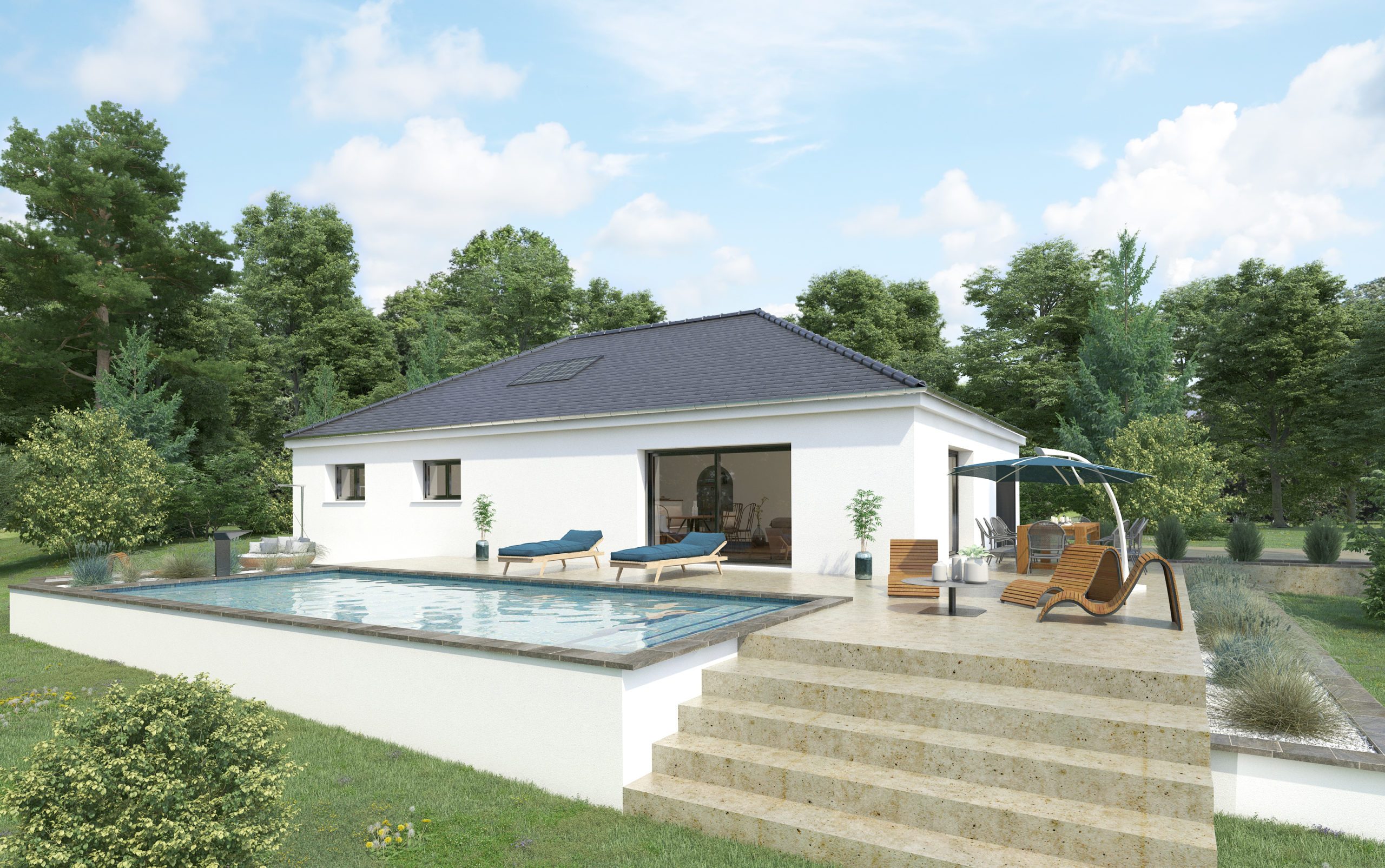 Ce modèle de plain-pied, très apprécié, est particulièrement populaire auprès des séniors. Conçue sans escalier, elle peut être facilement adaptée aux normes PMR (Personnes à Mobilité Réduite), offrant ainsi une maison agréable à vivre pour tous.