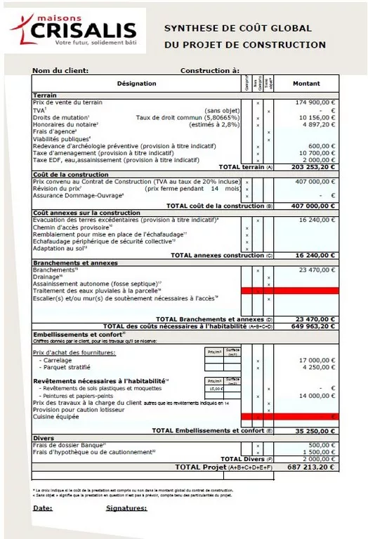 Cet accompagnement permet de sécuriser le budget avant toute demande de prêt et tout est regroupé dans un même document remis lors de la signature du CCMI la synthèse de coût globale.